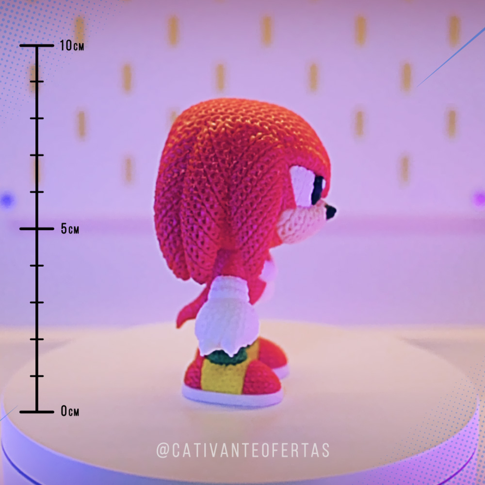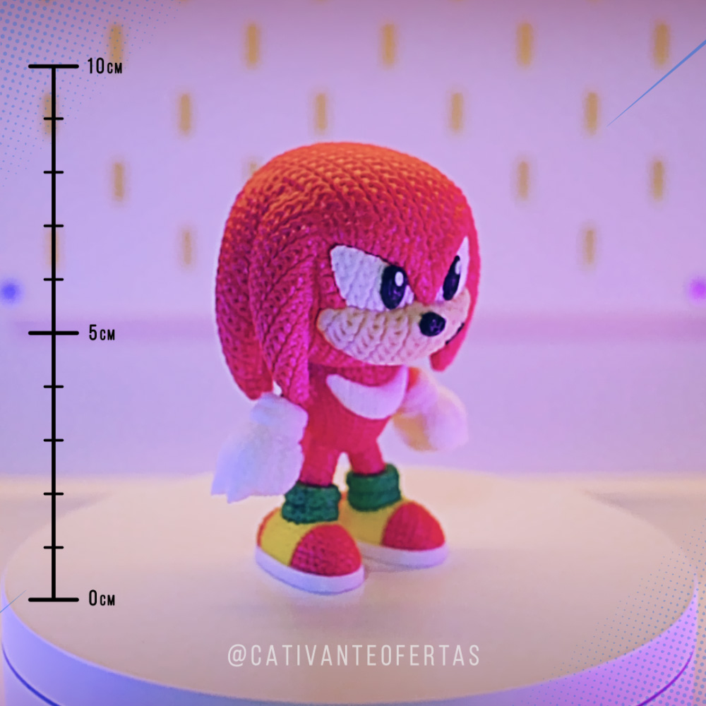 Boneco estilo crochê com aproximadamente 10 cm de altura, com textura fielmente reproduzida por impressão 3D de alta qualidade. O acabamento preciso e as cores vibrantes valorizam cada detalhe, unindo a força e a bravura de Knuckles, tecnologia e arte em um só item.