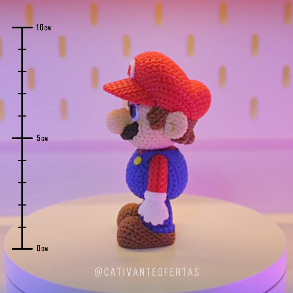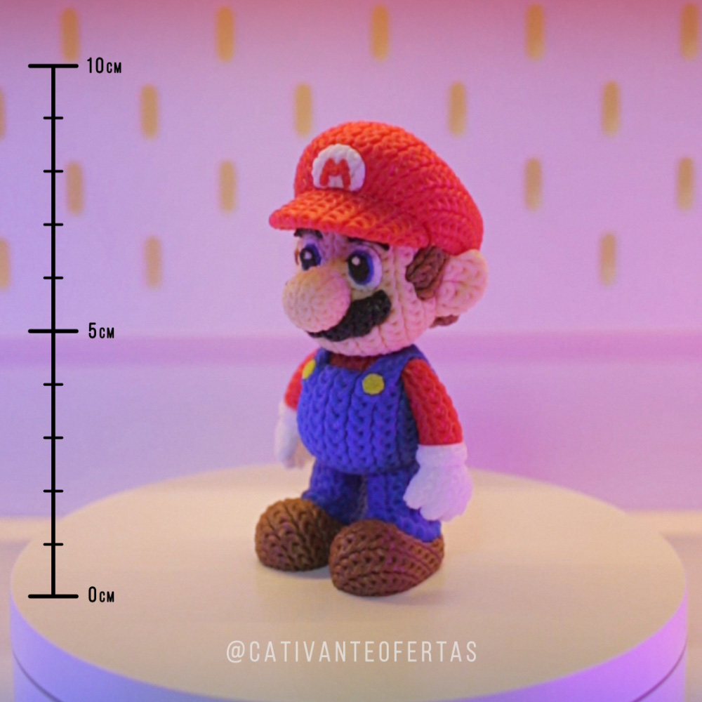 Boneco estilo crochê com aproximadamente 10 cm de altura, com textura fielmente reproduzida por impressão 3D de alta qualidade. O acabamento preciso e as cores vibrantes valorizam cada detalhe, unindo a coragem, o espírito aventureiro do Mario, tecnologia e arte em um só item.